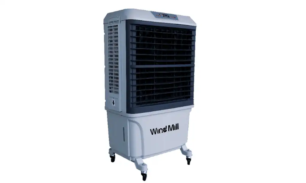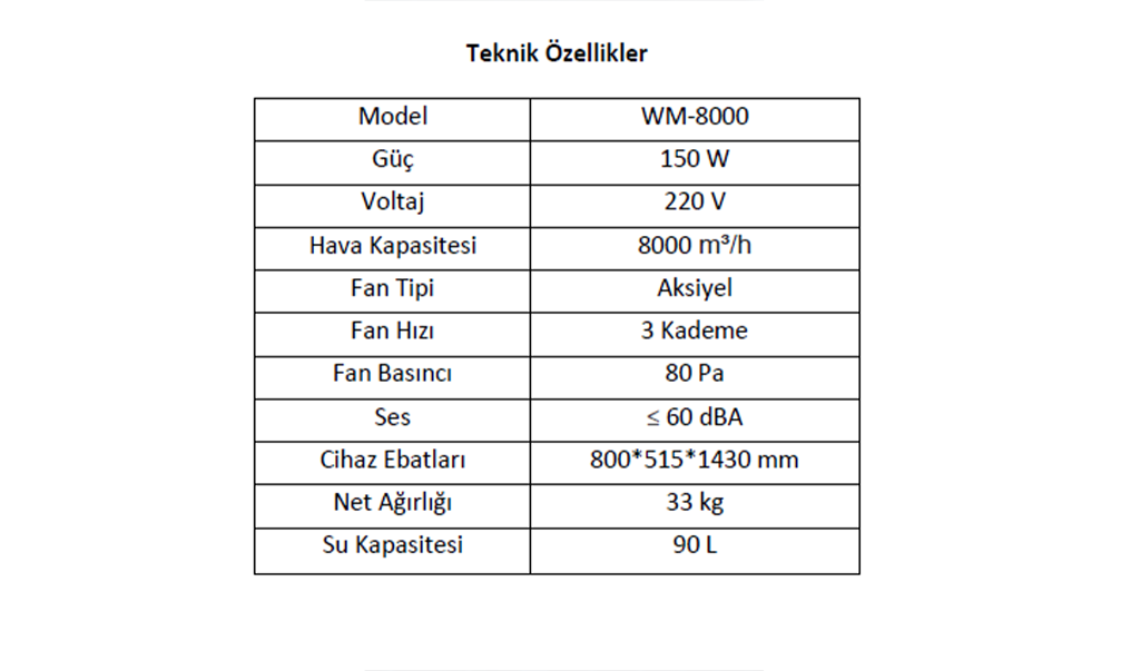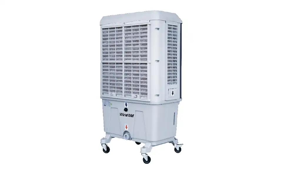 WM-8000 mobil evaporatif taşınabilir klima, %100 taze hava ile serinlik sunar. Düşük enerji tüketimi ve taşınabilir yapısıyla açık ve kapalı alanlar için idealdir.